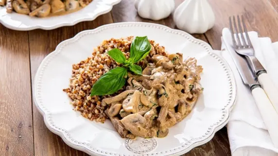Борщ, Гречка со свининой с грибами, Салат "Свекла с чесноком", Компот Яблочный, Булочка-хлеб белая