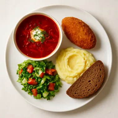 Борщ, Пюре Зраза куриная, Кар-ланч (салат), Булочка-хлеб белая