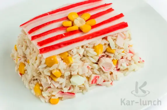 Крабовые палочки, Рис длиный ( Шахзаде), Огурцы, Кукуруза, Укроп, Майонез МЖК, Соль