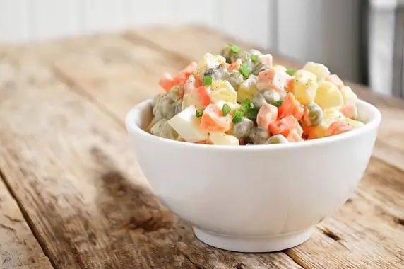 Колбаса докторская, Картофель, Морковь, Огурцы соленые, Яйца куриные, Горошек зеленый, Укроп, Петрушка, Майонез МЖК