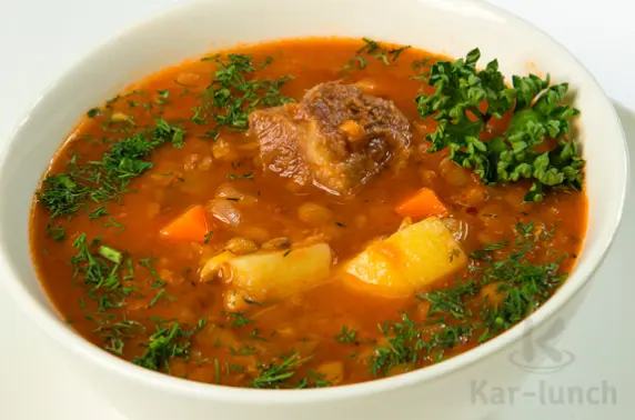 Чечевица, Картофель, Лук репчатый, Морковь, Соль, Петрушка, Говядина, Масло топленое