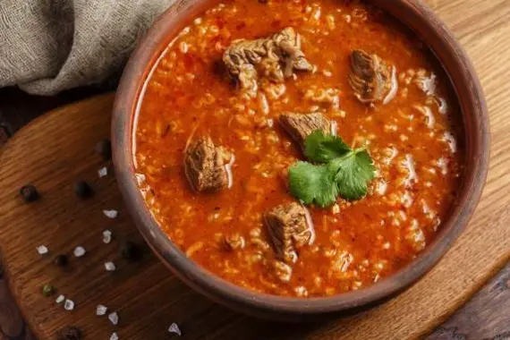 Рис длиный ( Шахзаде), Масло подсолнечное, Лук репчатый, Морковь, Томатная паста, Острый перец , Сельдерей, Говядина, Соль