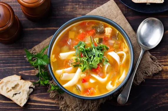 Картофель, Курица, Лук репчатый, Морковь, Перец болгарский, Масло топленое, Лапша домашняя, Укроп