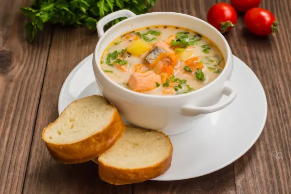 Картофель, Лук репчатый, Морковь, Горбуша, Сливки, Укроп