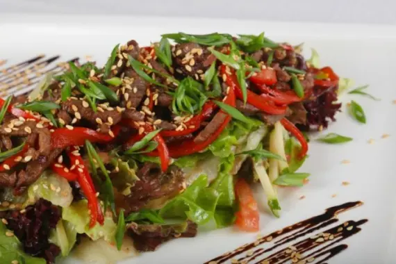 Говядина, Перец болгарский, Помидоры Черри, Айсберг, Мед, Соус горчичный