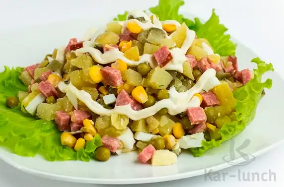 Картофель, Колбаса копченая, Яйца куриные, Огурцы соленые, Горошек зеленый, Кукуруза, Майонез МЖК, Соль, Перец черный молотый