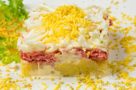 Картофель, Колбаса копченая, Яйца куриные, Перец черный молотый, Соль, Соус чесночный