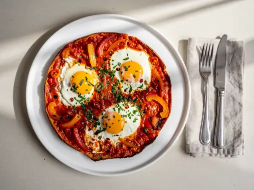 Яйца куриные, Помидоры Черри, Лук репчатый, Перец болгарский, Чеснок, Масло оливковое, Петрушка, Соль крупная